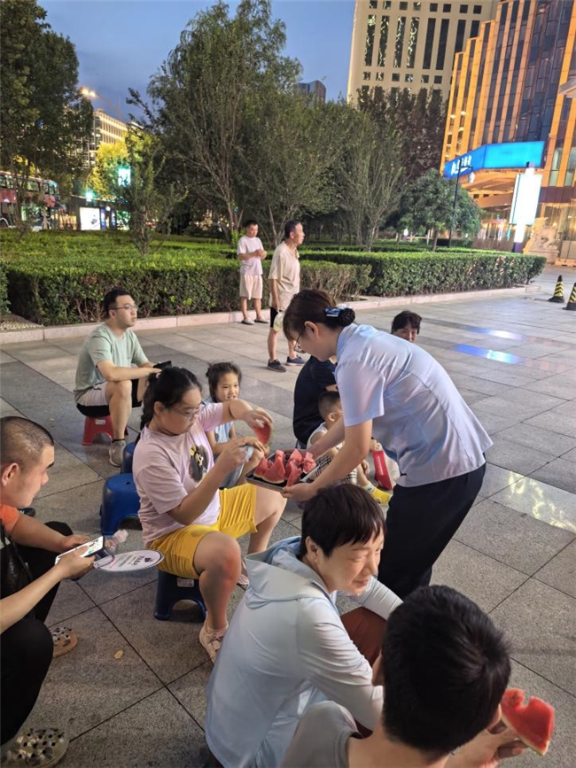 夏日炎炎,我们支行地属友谊路主干道,经常会封路,交警们在烈日下坚守岗位,指挥交通。银行工作人员看在眼里,很是感动,我们支行在行长带领下主动组织了一场“爱心送清凉”活动。大家将行里的矿泉水放到冰箱冷藏,河西支行全体员工带着矿泉水来到交警执勤点,将水递到交警手中,并且告知交警,网点冰箱里一直冰着水,欢迎随时过来取。一瓶水虽轻,却道出了银行对户外工作者的敬意,让忙碌的街头多了份守望相助的温情。我支行将此项服务常态化,后续持续开展送清凉活动,河西支行始终坚信,服务不止于柜台,更在于融入城市肌理,用点滴行动温暖坚守者,让善意在街头巷尾流转,共绘文明城市的温情画卷。